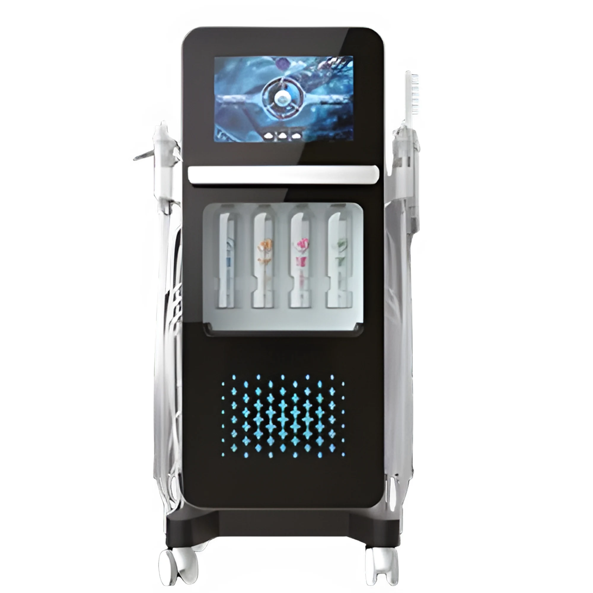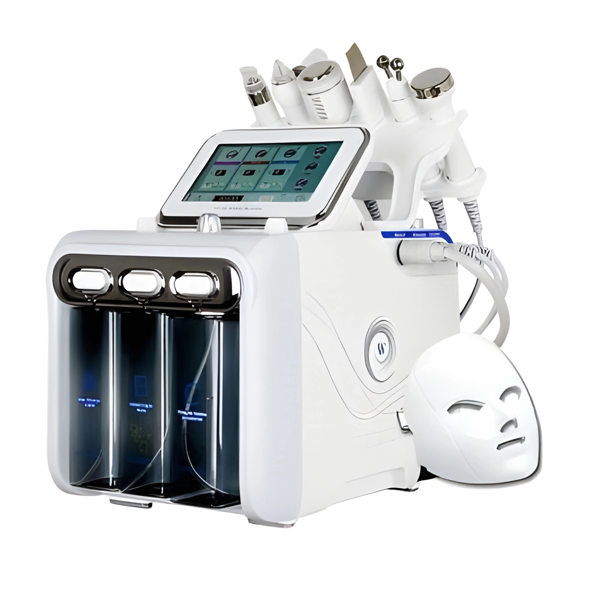 It features advanced hydrogen-oxygen technology combined with multiple treatment modalities including Aqua Facial, RF, Ultrasound, Cold Hammer, Spray Gun, and Skin Scrubber — all in one device.